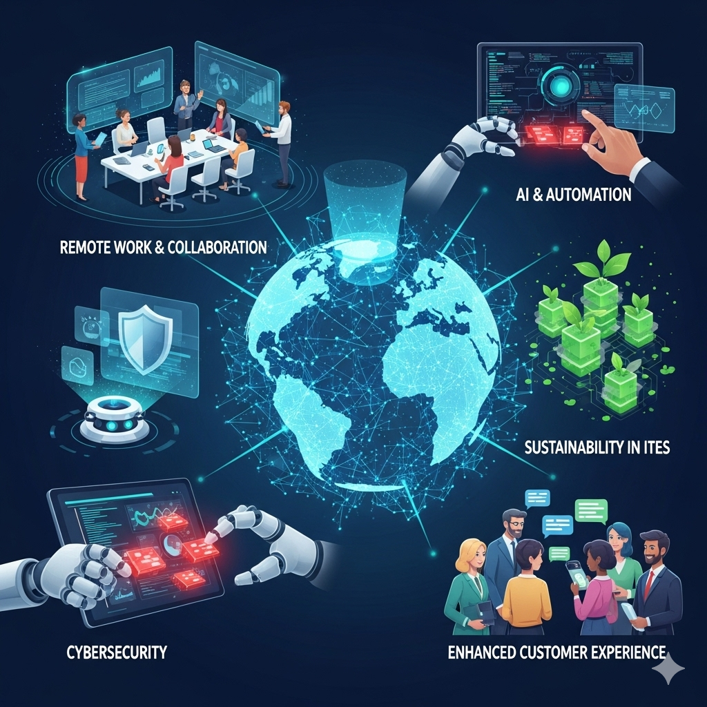 বর্তমানে, ITES সেক্টরে বেশ কিছু গুরুত্বপূর্ণ প্রবণতা (Trends) দেখা যাচ্ছে যা এই শিল্পকে নতুন দিকে নিয়ে যাচ্ছে: